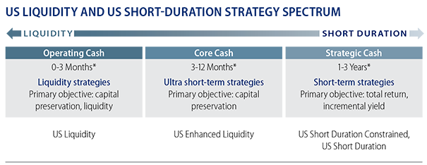 The Western Asset US Liquidity and US Short Duration suite of strategies provides solutions for Operating Cash, Core Cash and Strategic Cash needs. These strategies span the liquidity, maturity and risk spectrum from extremely conservative (US Liquidity and US Enhanced Liquidity) to those that combine a conservative base with the intention of generating returns incrementally higher than just cash (US Short Duration Constrained, US Short Duration). Maturities range from extremely short (0-3 months) out to the 1-3 year range for US Short Duration Strategies. Whereas the most conservative strategies will mostly be comprised of US Treasuries and government securities, those further out the risk spectrum may utilize a broader investment set.
