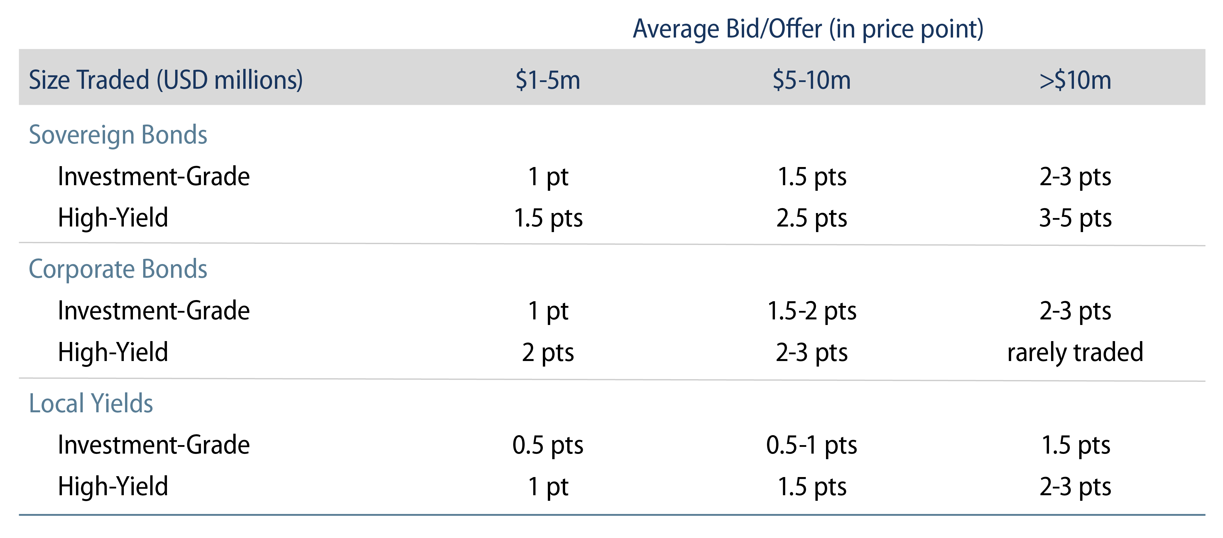 Liquidity in hard currency bonds has been on a steady decline since the global financial crisis (GFC). We think there are a few drivers behind this. First, and most importantly, the introduction of banking regulations after the GFC has limited the ability of banks to make markets and resulted in increased price volatility and wider bid/offer spreads.